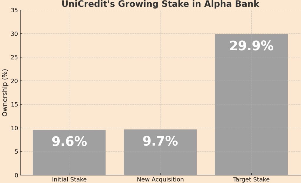 In a significant move underscoring its long-term commitment to Greece’s banking sector, Milan-based UniCredit has agreed to acquire an additional ~9.7% stake in Alpha Bank, parent company Alpha Services and Holdings S.A., for around €615 million, according to a Bloomberg report. This follows UniCredit’s existing 9.6% stake and will bring its total ownership to approximately 20%, allowing for equity consolidation and deeper integration of the two institutions.